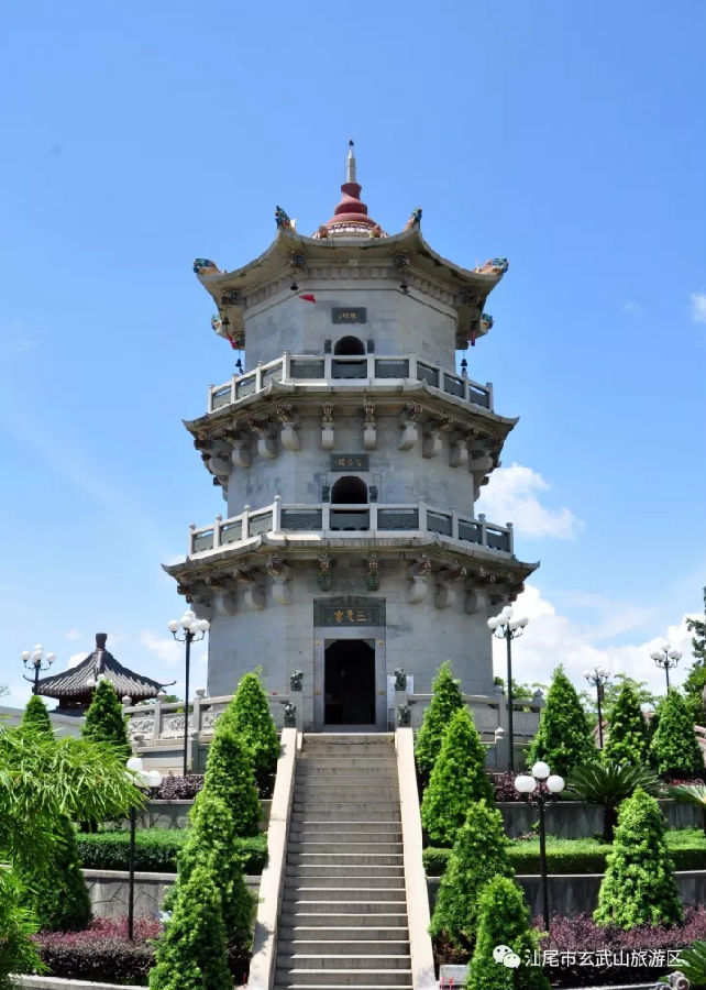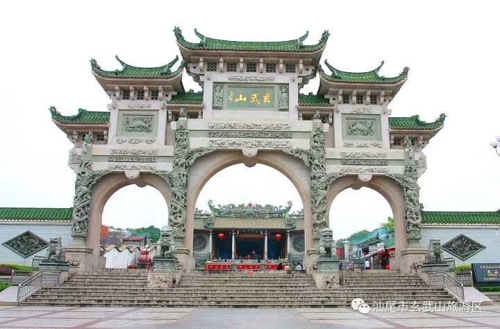 建于一九九六年,为四柱三门、三重檐、三开间牌楼式石雕牌坊,通告15.8米,面阔22.3米,是粤东地区规模最大的透雕龙柱石牌坊之一。牌坊正面石匾“玄武山”是原中国佛教协会会长赵朴初居士所题;背面石匾“灵光万丈”为原中国佛教协会常务理事、广东省佛教协会会长释新成大和尚所题。
