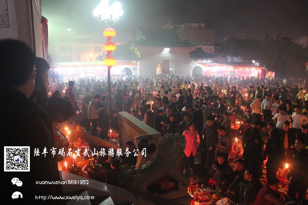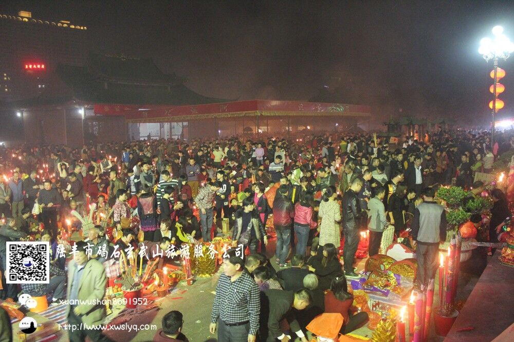 正月初一子时(“开门炮”后),玄武山路上人山人海,善男信女整装斋城备敬,满怀盛情愉快登临玄武山,向佛祖暨众神诸佛拜年祈福。玄武宝殿内外,人声鼎沸,香火缭绕,爆竹喧天。