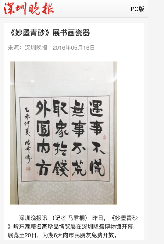 由深圳先行文化承办汕尾市玄武山书画院等单位协办的第十二届中国(深圳)文博会南山区分会场专项活动之“妙墨青砂”岭东潮籍名家珍品博览展与本月十五至二十日在深圳华侨城智慧广场隆盛博物馆隆重开展,本次展出以岭东潮人文化“名家书画、青花瓷器“展示和交流为主题,进行名家名作的展览。汕尾市玄武山书画院应邀组织创作优秀书画作品参加展出。