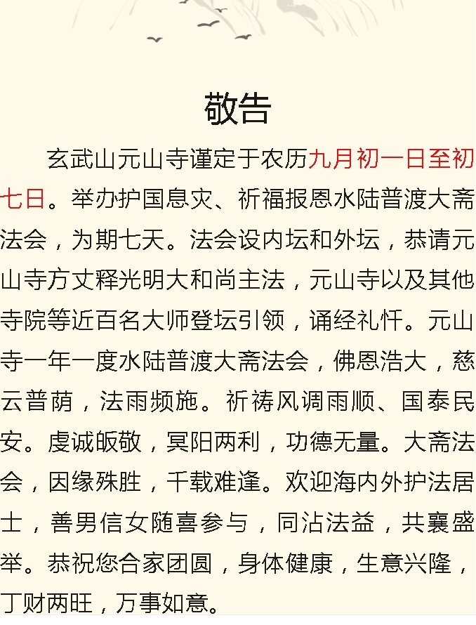 敬告!玄武山元山寺启建十方法界四圣六凡水陆空普渡大斋胜会